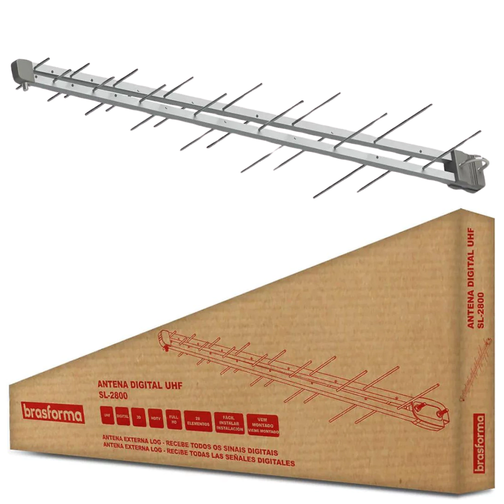 A antena externa Brasforma é excelente para toda a faixa de sinal UHF digital (HDTV, 3D, Full HD). É compatível com todos os modelos de TVs e conversores disponíveis no mercado, inclusive TVs de tubo e é produzida em alumínio com 95% de pureza que garante ótima recepção, as peças plásticas são em ABS de altíssima resistência e dipolos são fixados por prensa, que aumentam ainda mais sua durabilidade.