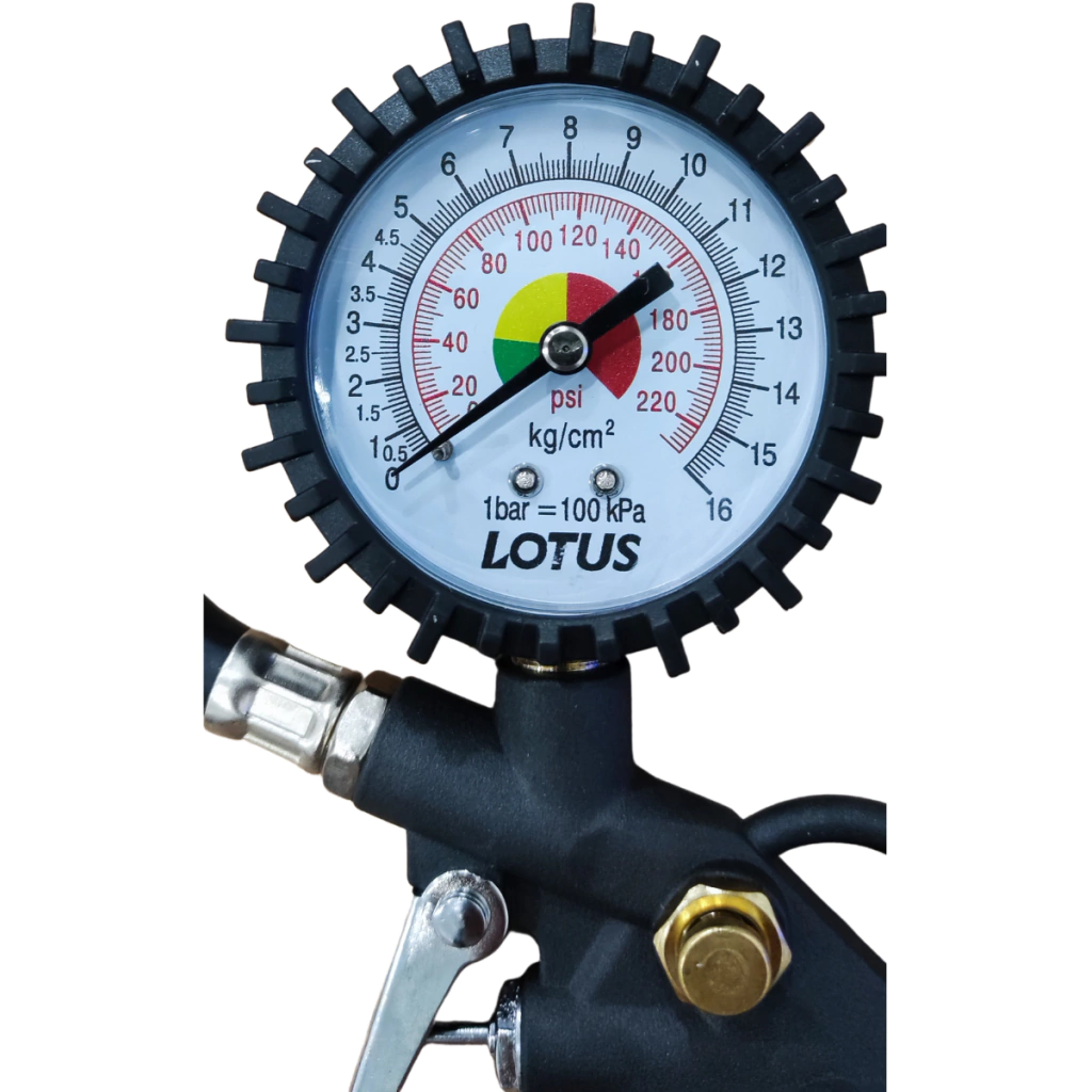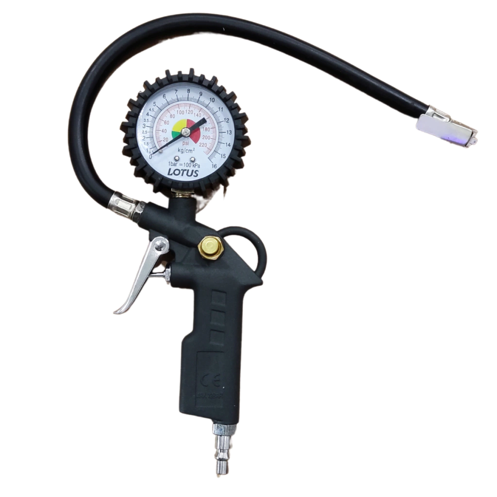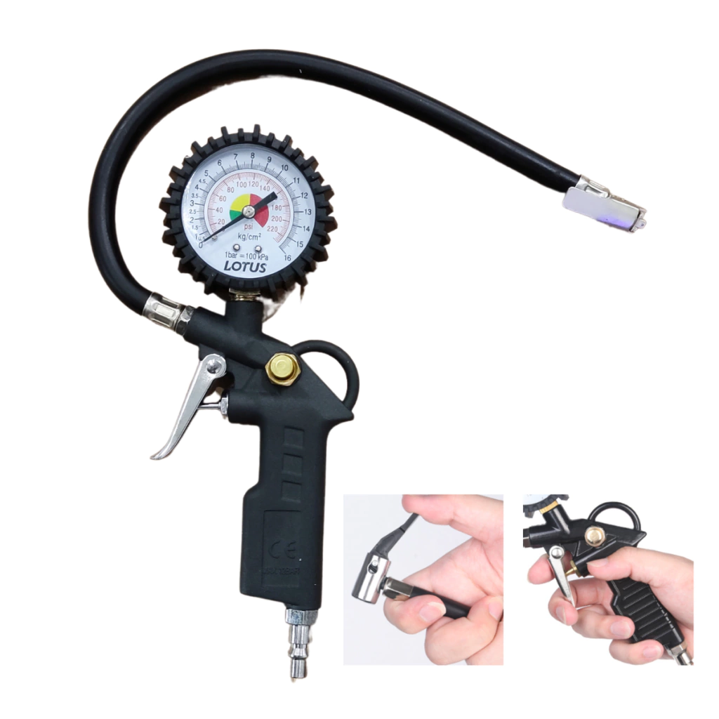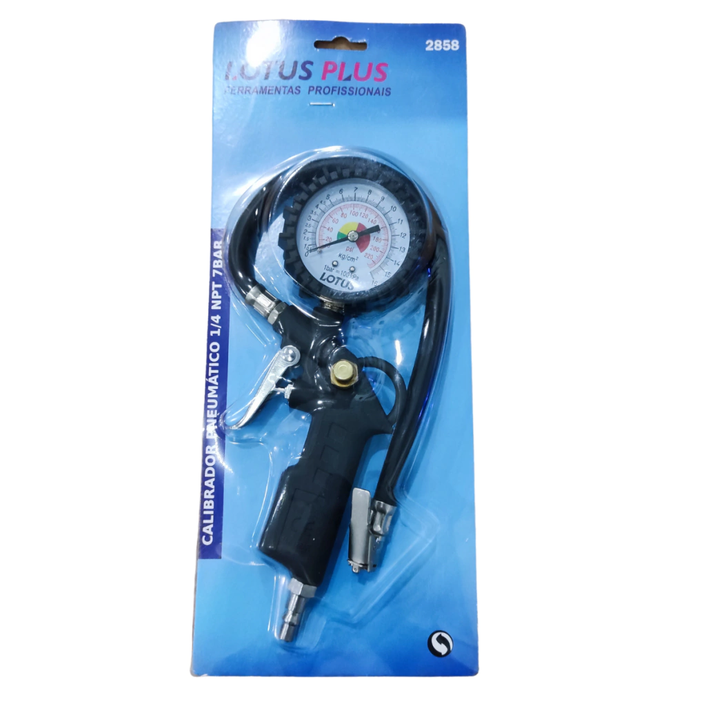 Calibrador e inflador de ABS, enche ou esvazia sem mover o conector do bico, ergonômico e fácil de usar. Possui manômetro que lê: 0 - 220 PSI, 0 - 15 Kg/cm² e 0 - 150 kPa., indicador de pressão de 50 mm, 1/4 NPT 7 BAR, mangueira prolongadora flexível de 33 cm (13"), rosca macho de 1/4" BSP (Padrão Britânico). Corpo de metal com proteção de borracha anti queda em volta do indicador de pressão; bico prendedor para fácil operação; gatilho para inflar e botão para alívio de pressão; insuflador de alta qualidade; clip de fixação de ângulo único; fornece pressão precisa com uma rápida e fácil pressão do polegar; mandril de pneu de alta qualidade de zinco com clip de aço.
