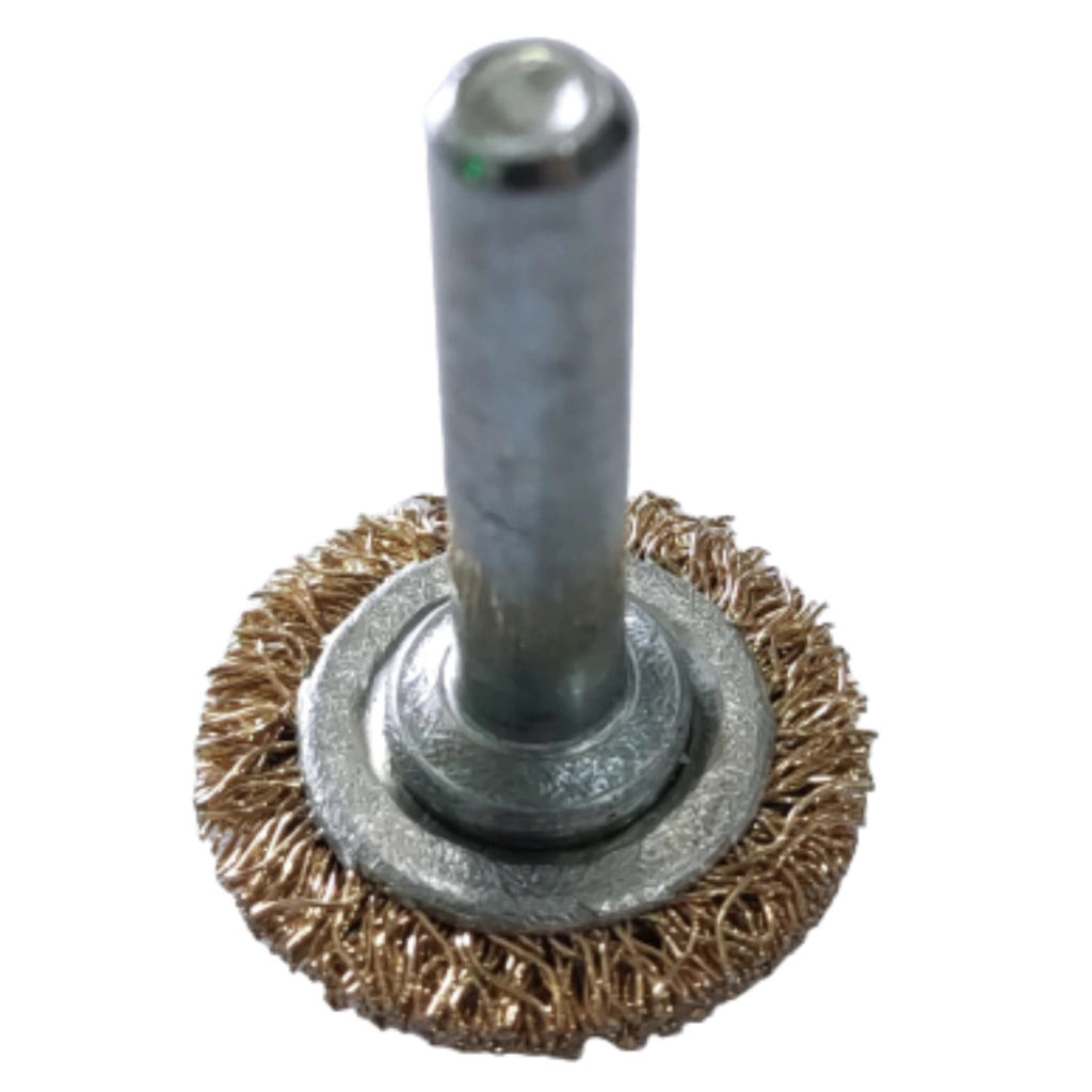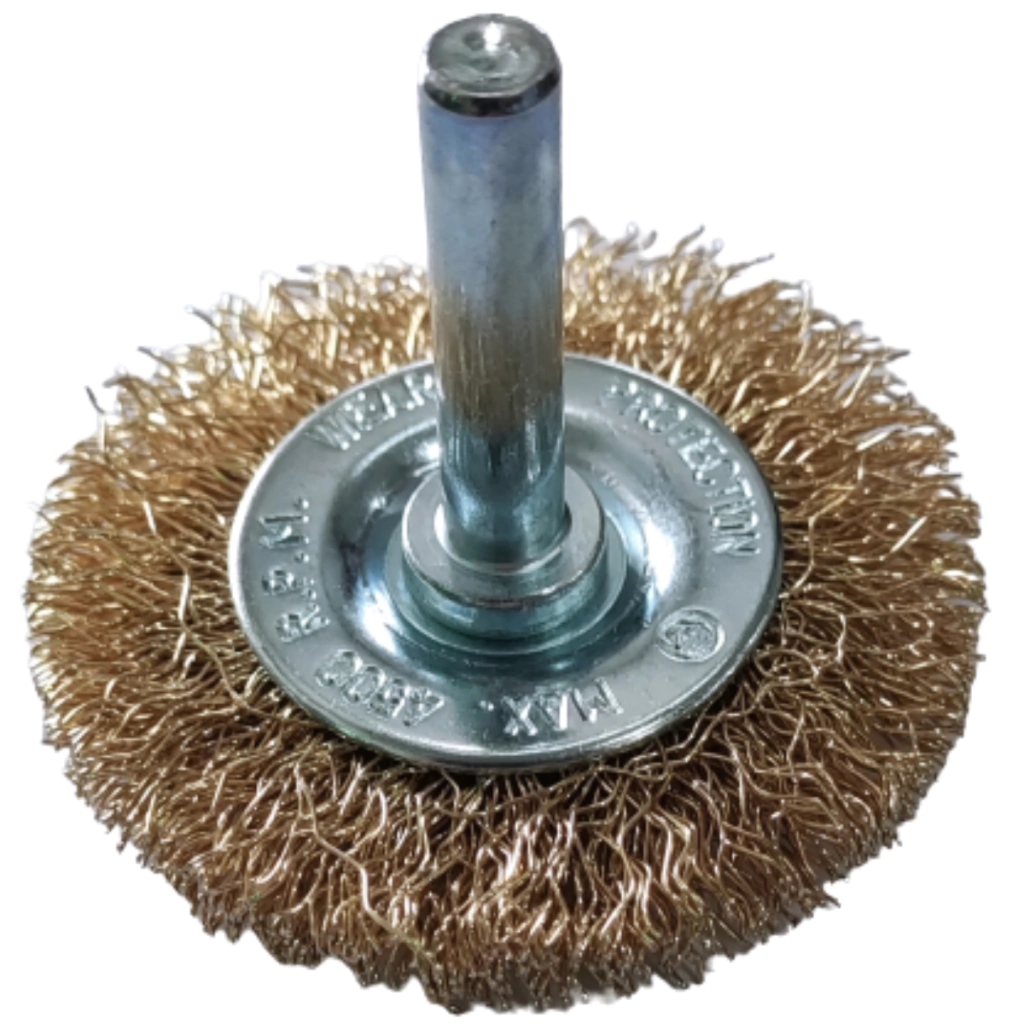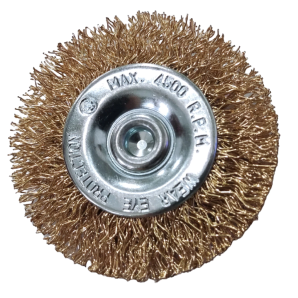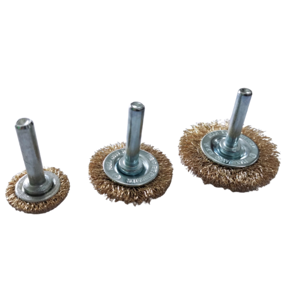 Jogo de 3 escovas circulares de aço, com haste (encaixe) de 1/4" (aprox. 63 mm), diâmetro 1", 1 1/2", 2" (Aprox. 25 38 50 mm), com tufos de cerdas de aço latonado incrustradas firmemente na base central, para limpeza de ferrugem, pintura, colas, gorduras secas, em grelhas, ferragens e superfícies em geral, acopláveis em furadeiras, esmeril e esmerilhadeiras