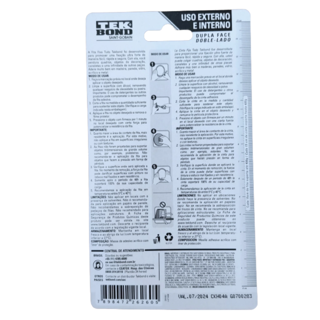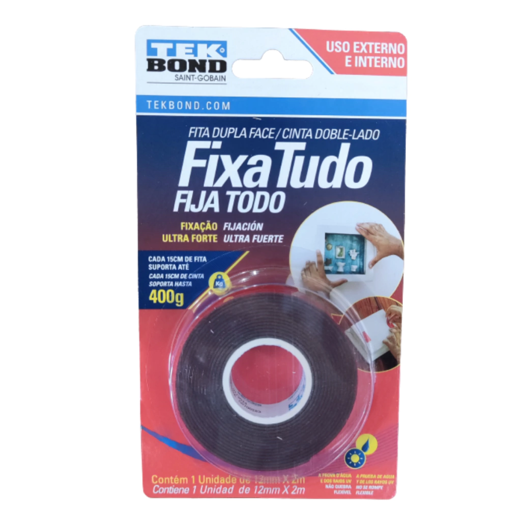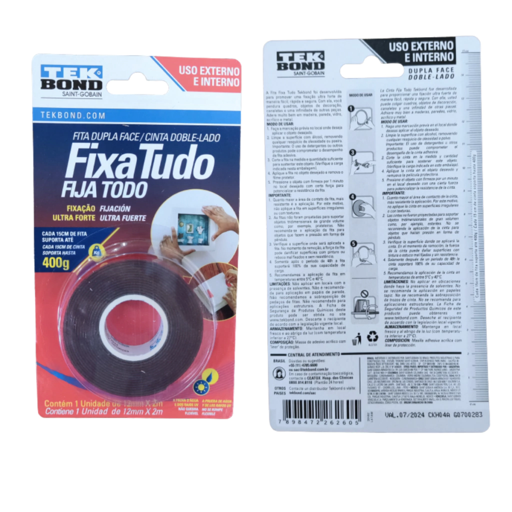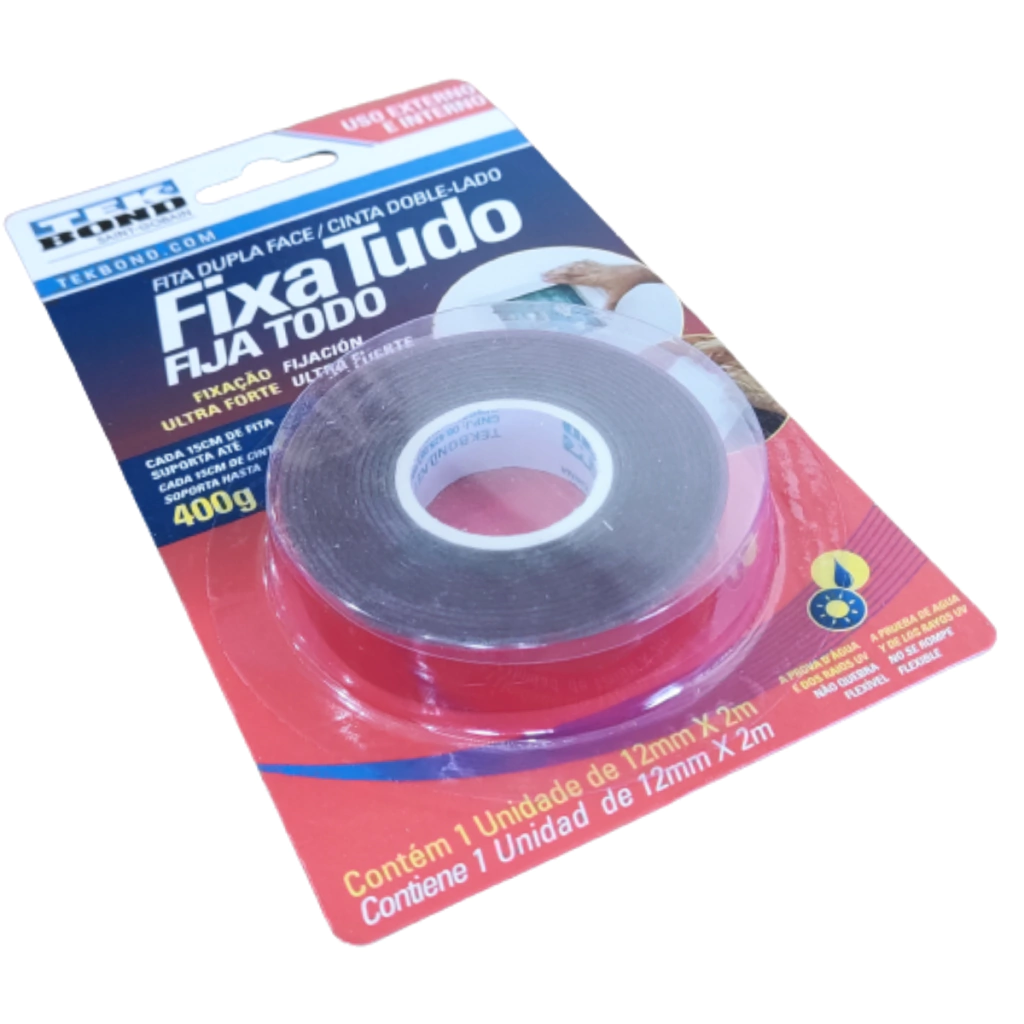 Fita Fixa Tudo é uma fita acrílica indicada para promover fixação ultra forte de maneira fácil, rápida e segura. Adaptada ao uso interno e externo, resiste aos efeitos da água e raios UV. Permite pendurar quadros, objetos de decoração, canaletas, entre outras peças. Adere em várias superfícies, como madeira, parede, vidro, acrílico e metal.