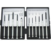 Jogo chaves de precisão em liga de aço carbono forjado, temperado e fosfatado, medidas: 00 - 0 - 1 - 1 Ponteiro - 1 Batedor - 1 - 1,2 - 1,4 - 1,8 - 2,4 e 3mm, com corpo de aço cromado e cabeça giratória que facilita operação com apenas uma mão, em resistente caixa plástica. Ideal para relojoeiros, profissionais de eletrônica, entre outros.