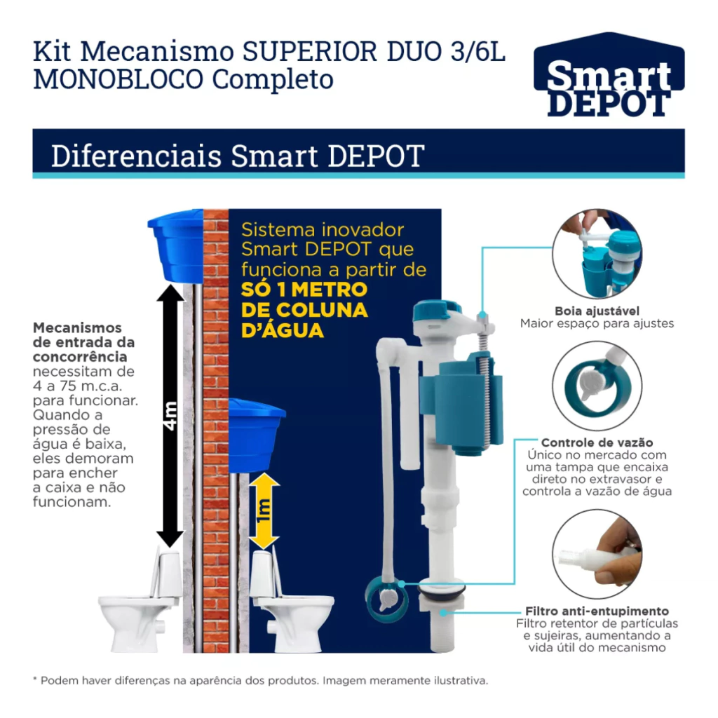 - Sistema de regulagem da bóia que permite ajuste de vazão e entrada de água;