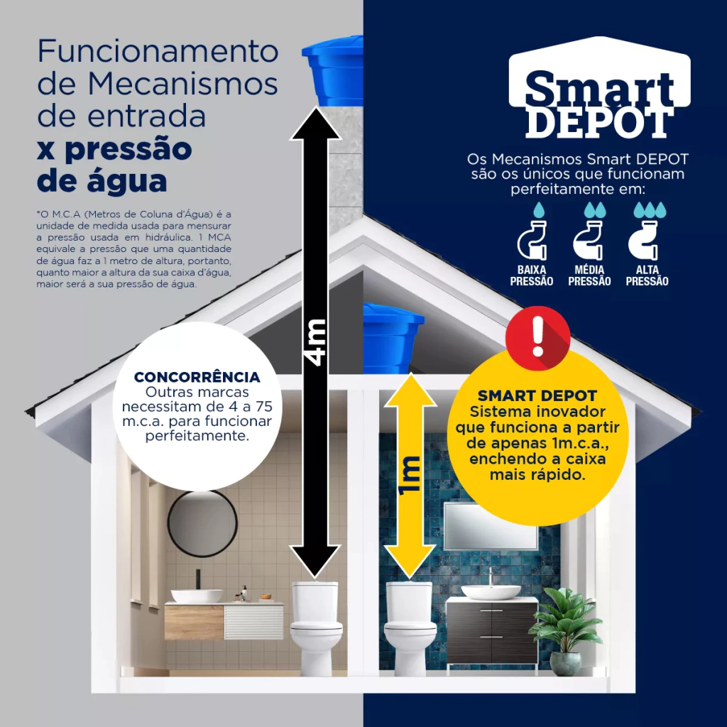 - Funciona em alta e baixa pressão, com capacidade parcial de 3 litros ou total de 6 litros, promovendo economia de água em até 50 %;