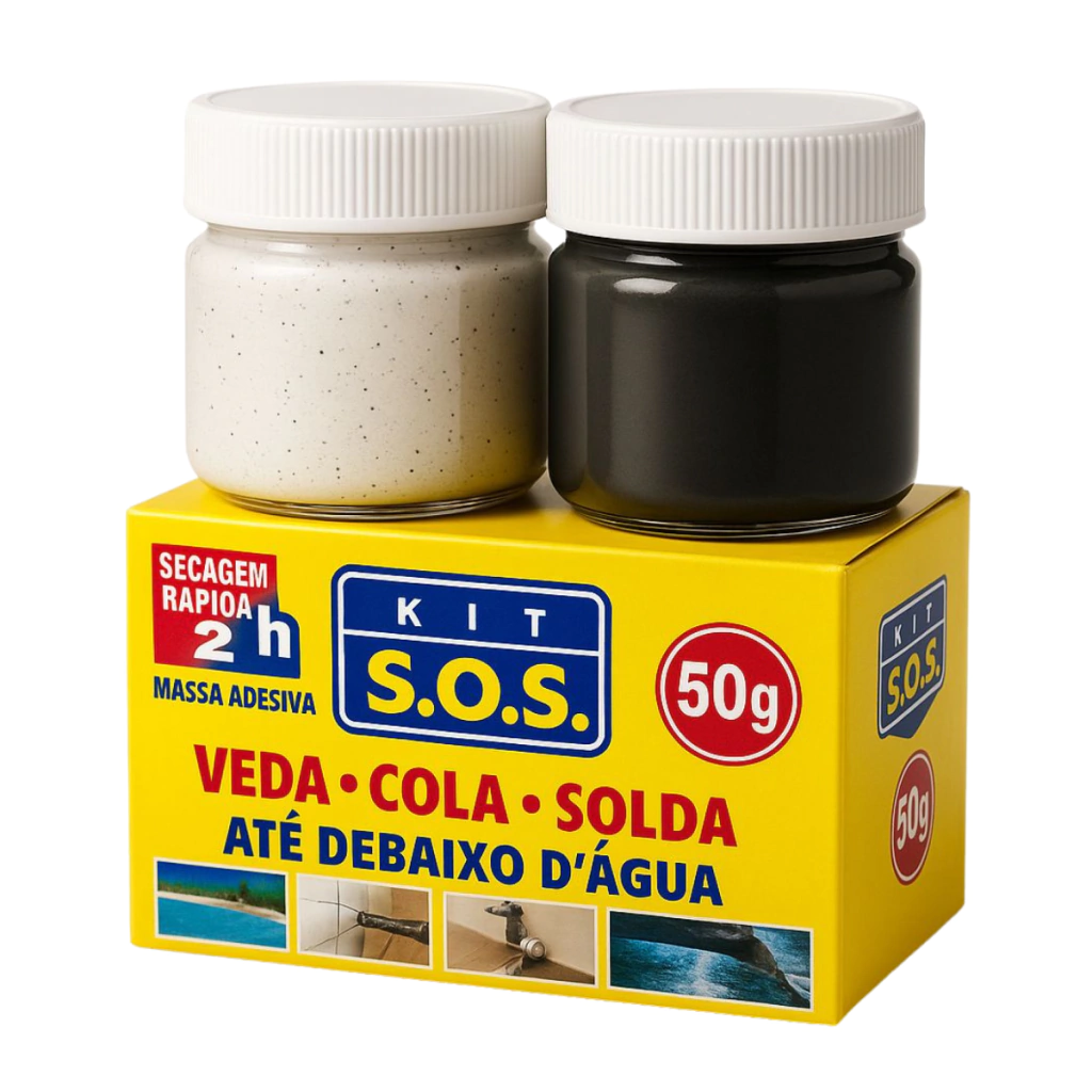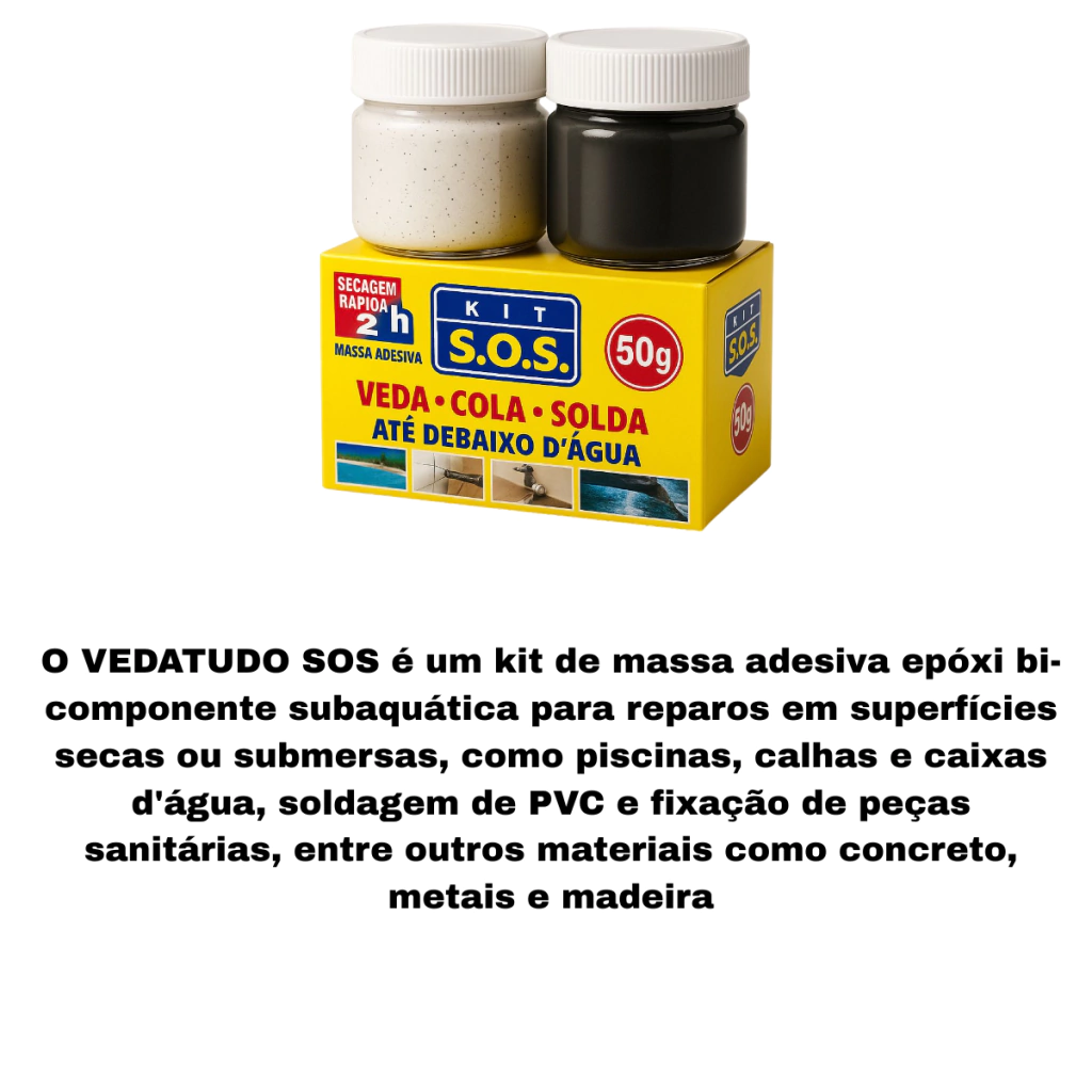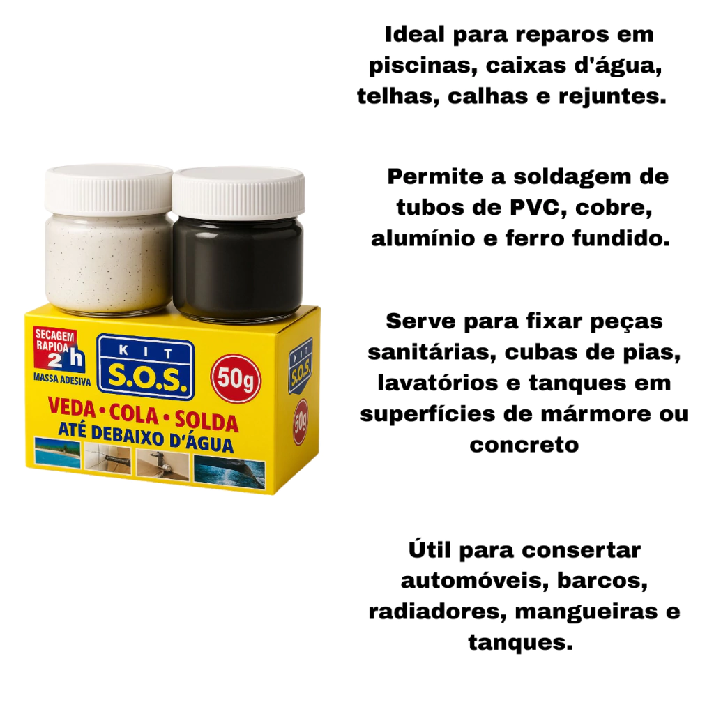 O KIT SOS é uma massa adesiva epóxi subaquática bi-componente, indicada para aplicação tanto submersa quanto em locais secos, em qualquer tipo de superfície rugosa.