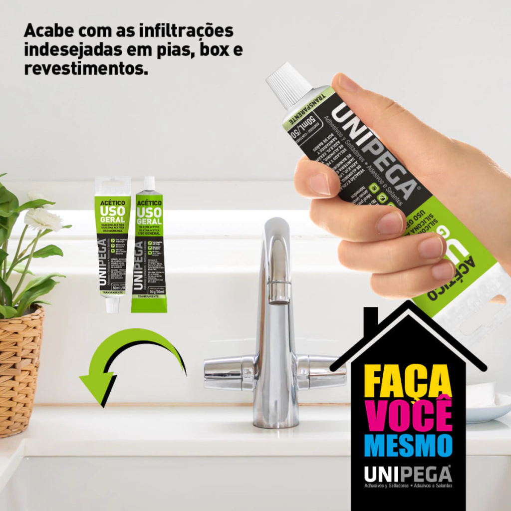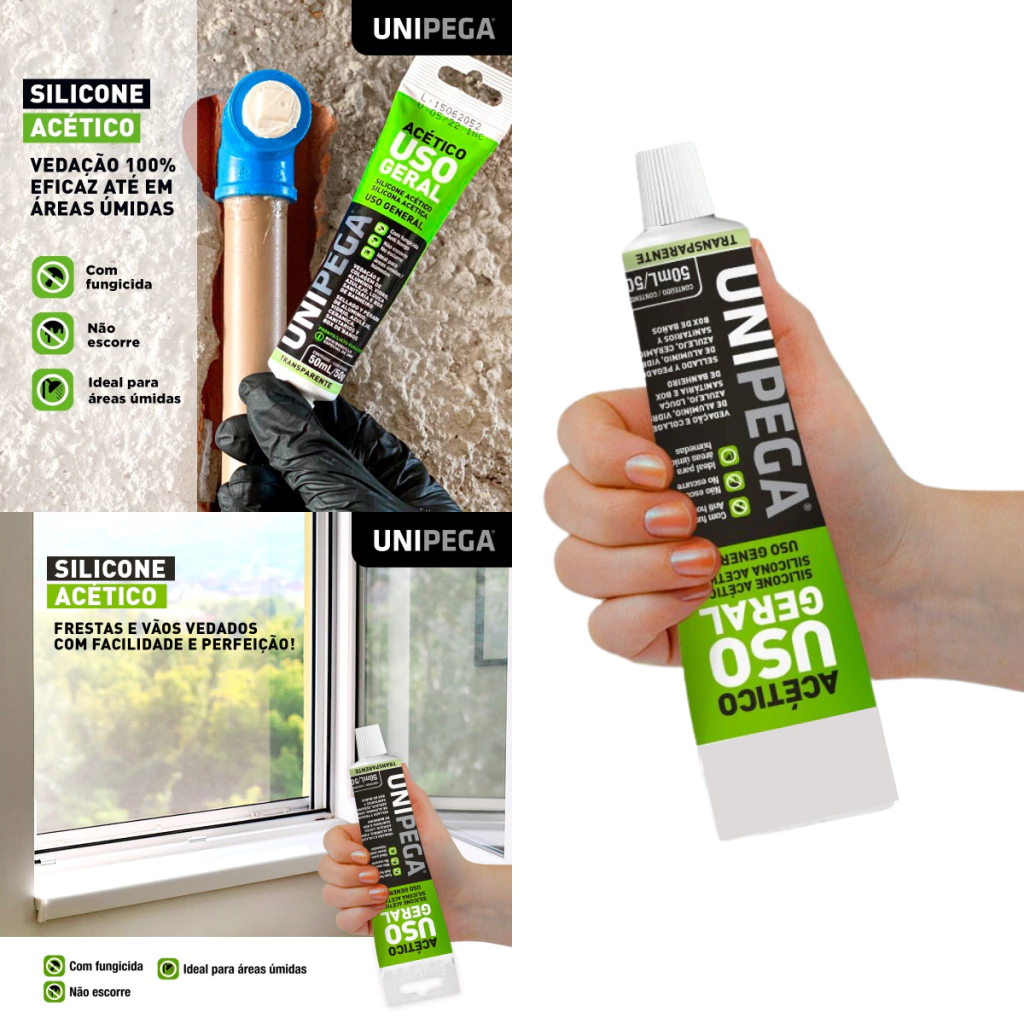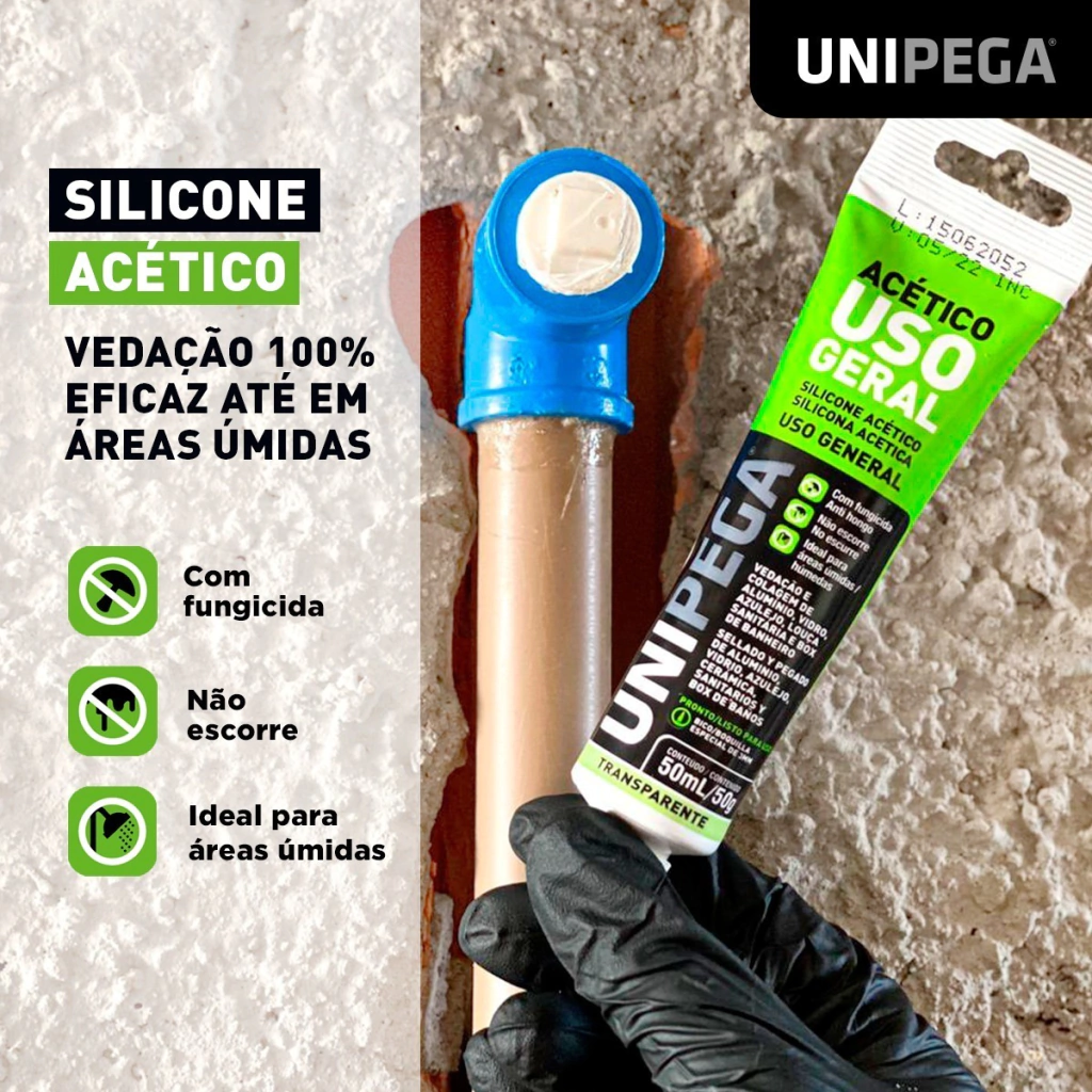 Selante de silicone monocomponente cura acética indicado para vedação e colagem de alumínio, vidro, azulejo, louça sanitária e box de banheiro. Resistente à formação de fungos. Com propriedades de não escorrimento, cura com a umidade atmosférica, transformando-se em uma borracha flexível e resistente.